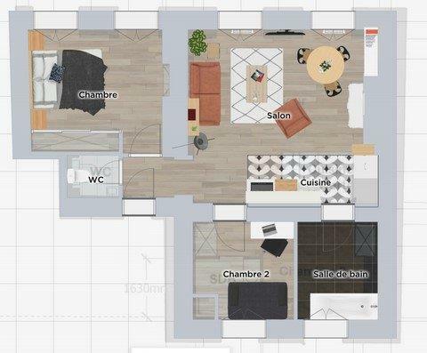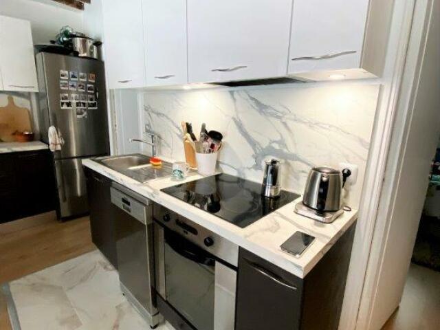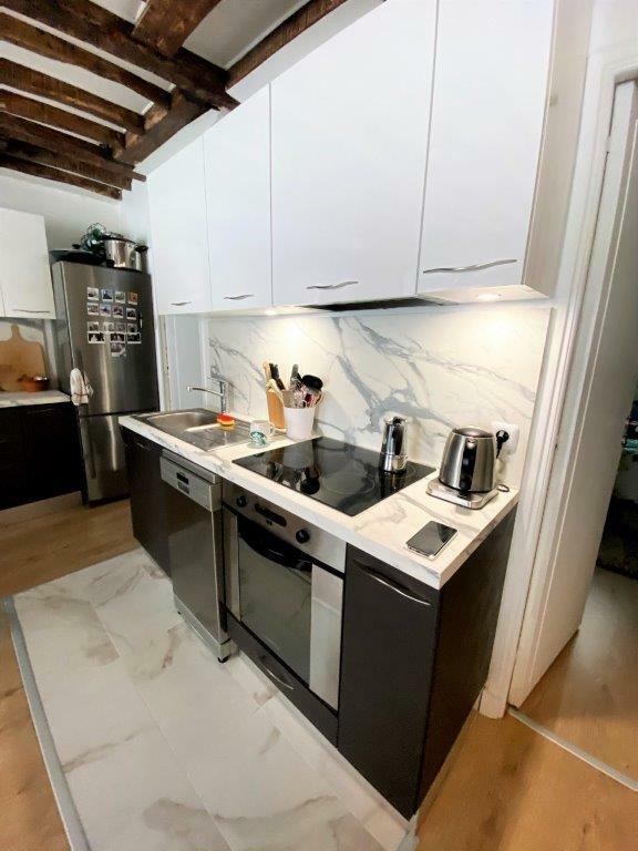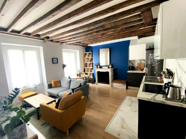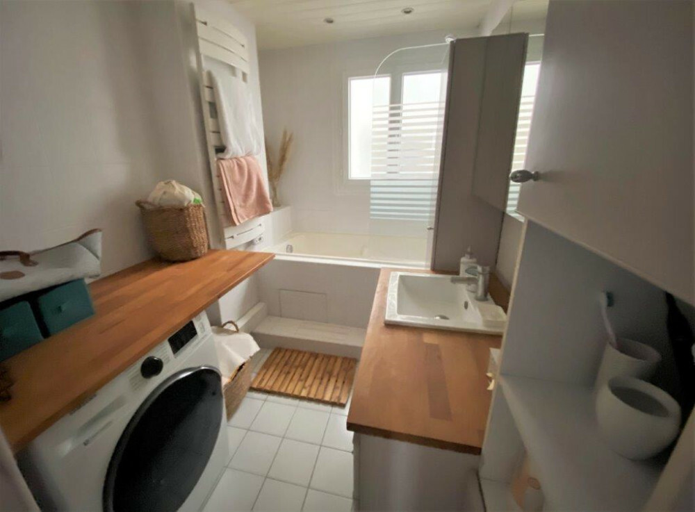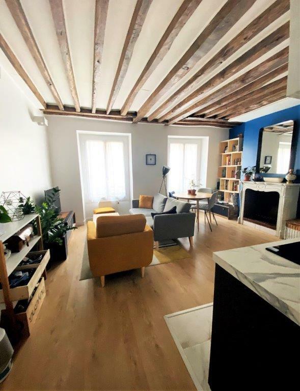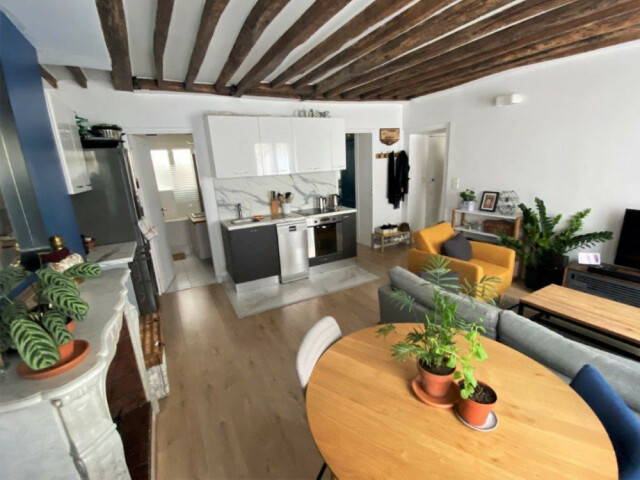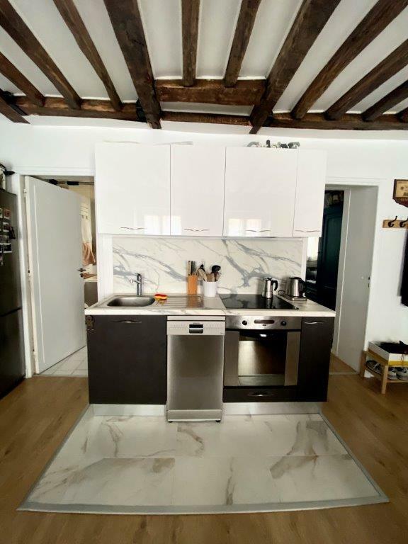 Entrée avec grand placard de rangements, beau séjour avec cuisine aménagée et équipée (21 m²) , une chambre avec placard (12 m²), Bureau télétravail avec placards (10m²), salle de bains meuble vasque (fenêtre, wc séparés avec placard, grande cave. Lumineux et rue calme - Charme de l'ancien, poutres apparentes , cheminée en marbre dans le séjour